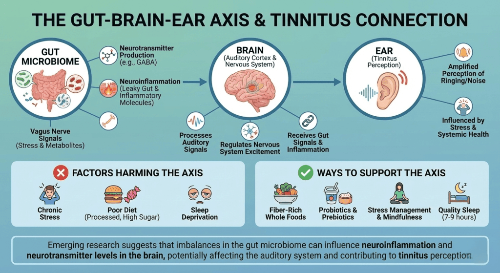 Stress directly impacts your gut microbiome, which in turn can increase inflammation and disrupt the balance of neurotransmitters like GABA. This creates a cascade effect that may amplify tinnitus perception. Managing stress through mindfulness, sleep, and relaxation techniques can help calm the gut-brain-ear axis.
