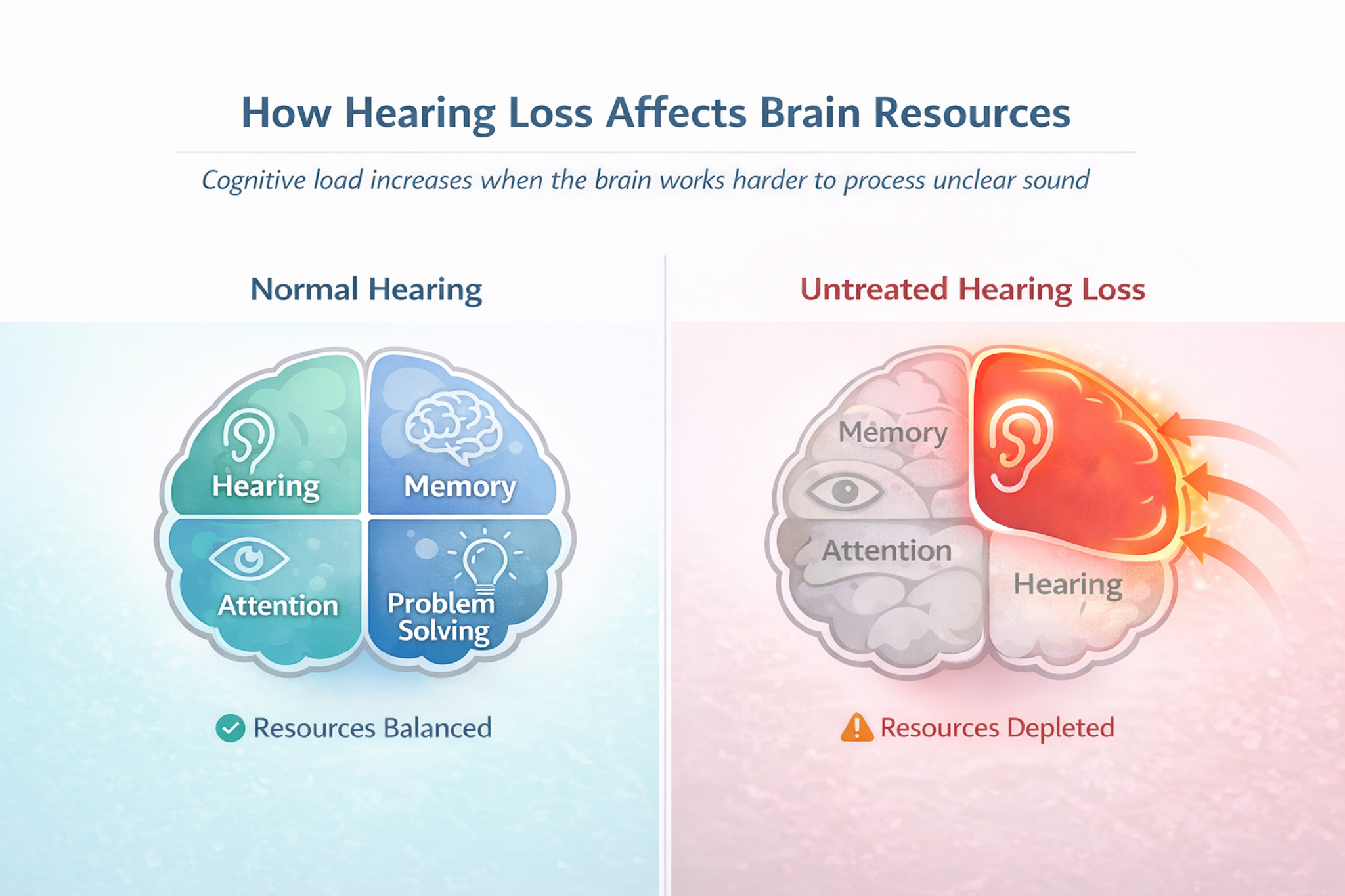- Untreated hearing loss increases cognitive load, meaning the brain must work harder to process unclear sound, diverting mental resources from memory and attention.